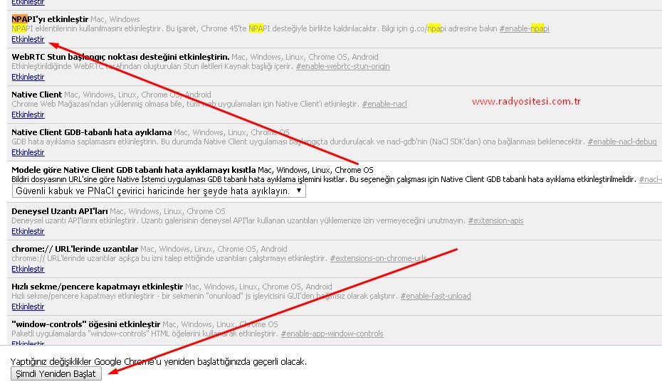 2-NPAPI yi etkinleştir diyip altta açılan balondan şimdi yeniden başlata tıklayıp chrome yi tekrar başlatıyoruz.
