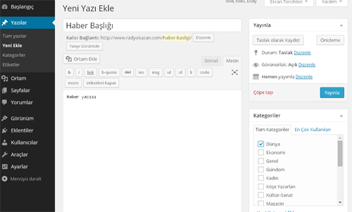 Altdaki örnek de görüldüğü gibi üst kısıma “Haber Başlığı” giriniz. hemen altına haber içeriği giriniz. sağ taraftan haberin yer alacağı kategoriyi giriniz.