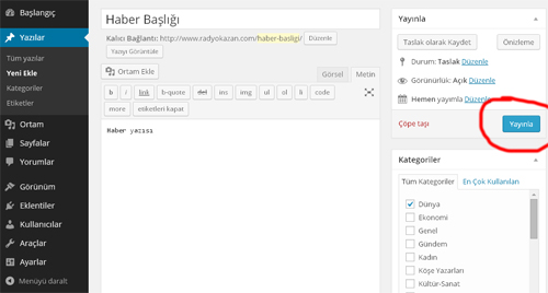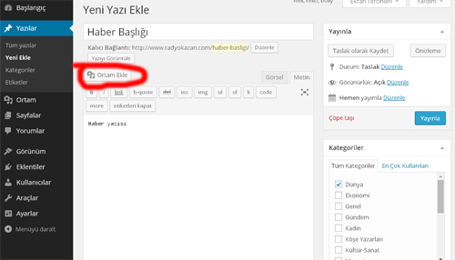Haber Eklemek için Resimde kırmızı renkle çevrili kısımda “YAZILAR” kategorinden “Yeni Ekle” menüsüne tıklayınız.