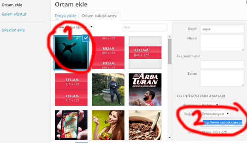 Reklamları Eklemek için “Ortam ekle” kütüphane “Eksiz” kısmına girerek reklamların boyutunda reklamlar hazırlayarak “reklam1.jpg, reklam2.jpg, reklam3.jpg” şekliden kendi yapmış olduğunuz reklamları ortamdan ekleyerek reklam alanı resimlerini değiştirebilirisniz. reklam alnı resimlerini indirip daha sonra silip yenisini yüklemelisiniz.