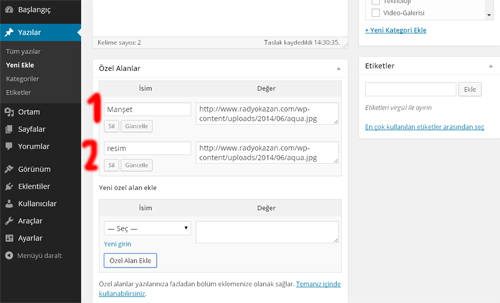 daha sonra kopyaladığımız uzantıyı aşağıdaki resimde görüldüğü gibi normal sitede görükecek reim ise “Resim” i seçip oraya tıklıyoruz. “manşet” ise daha büyük bir resim olarak “manşet” i seçip “Yeni özel alan ekle” kısmından “özel alan ekle” butonuna tıklıyoruz.